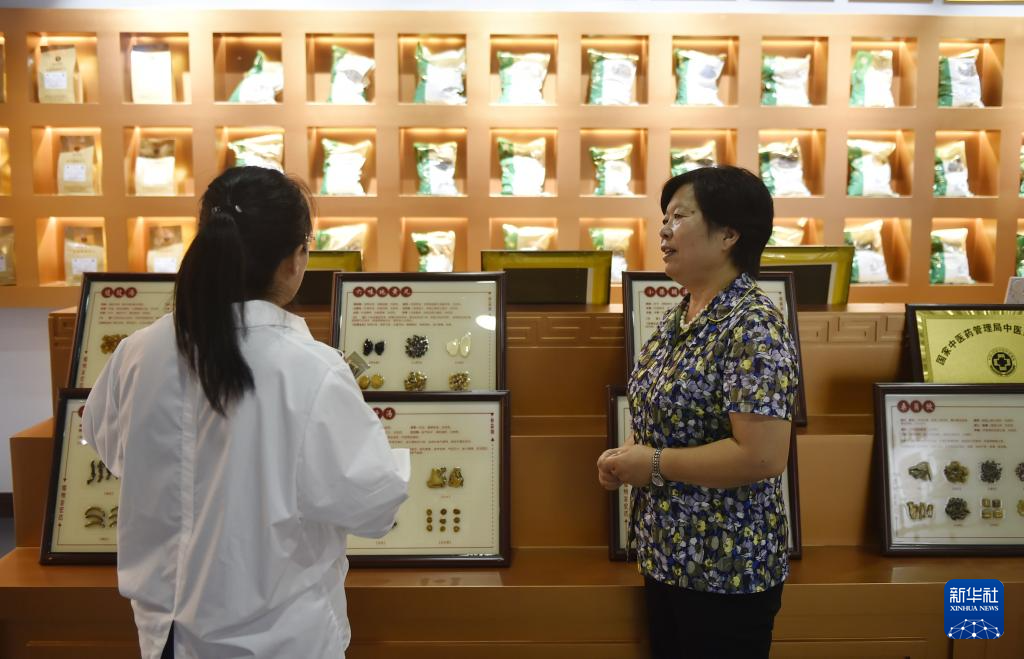 8月4日,在禹州中醫(yī)藥文化技藝傳習館,非遺項目“禹州中藥加工炮制技藝”代表性傳承人朱改蓮(左)向參觀者介紹中藥材知識。