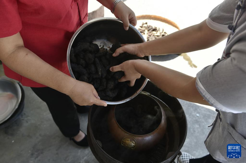 8月4日,在禹州中醫(yī)藥文化技藝傳習館,非遺項目“禹州中藥加工炮制技藝”代表性傳承人朱改蓮(右)展示中藥材“九蒸九曬”加工技藝。