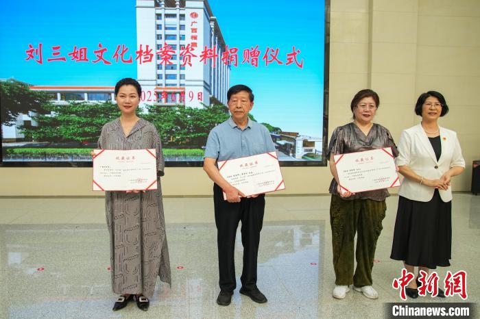 當天活動現(xiàn)場還舉行了劉三姐文化檔案捐贈儀式,柳州《劉三姐》創(chuàng)作組曾昭文、龔邦榕、鄧凡平、牛秀四位作家簽名的創(chuàng)作于1991年的彩調(diào)劇《劉三姐》(第九方案)封筆之作的手稿原件,也由其中的作者曾昭文之子捐贈。另外,廣西戲劇院、“劉三姐”扮演者傅錦華女兒傅彬彬等捐贈了相關“劉三姐”照片,廣西壯族自治區(qū)檔案館領導為捐贈者們頒發(fā)了收藏證書。