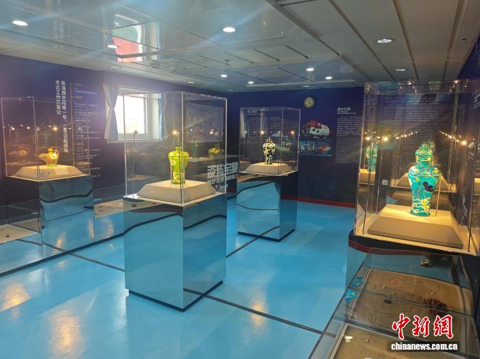 10月13日,全國首家海上流動博物館升級改造落成儀式在三亞舉行。圖為“南海之夢”號郵輪上全新推出的“深藍(lán)寶藏——南海西北陸坡一二號沉船考古成果特展”主題展覽。張月和 攝 南海西北陸坡一號、二號沉船遺址是中國“2023年度全國十大考古新發(fā)現(xiàn)”。2024年9月,“深藍(lán)寶藏——南海西北陸坡一二號沉船考古成果特展”在中國(海南)南海博物館面向公眾開放,408件(套)來自海底1500多米、“沉睡”了500多年的沉船遺址出水文物首次亮相。此次升級改造后的海上流動博物館中,就展出了多件沉船遺址出水琺華彩瓷器的復(fù)仿制品,供民眾觀賞。 此外,海上流動博物館在優(yōu)化原有的“美麗富饒的南?!眻D文展覽的基礎(chǔ)上,新增標(biāo)本展示區(qū)與文創(chuàng)空間等多個功能板塊,通過進(jìn)一步提質(zhì)擴(kuò)容,將“南海之夢”號郵輪打造為一座“移動的海洋文化客廳”,滿足游客多元化、互動化的觀展需求。