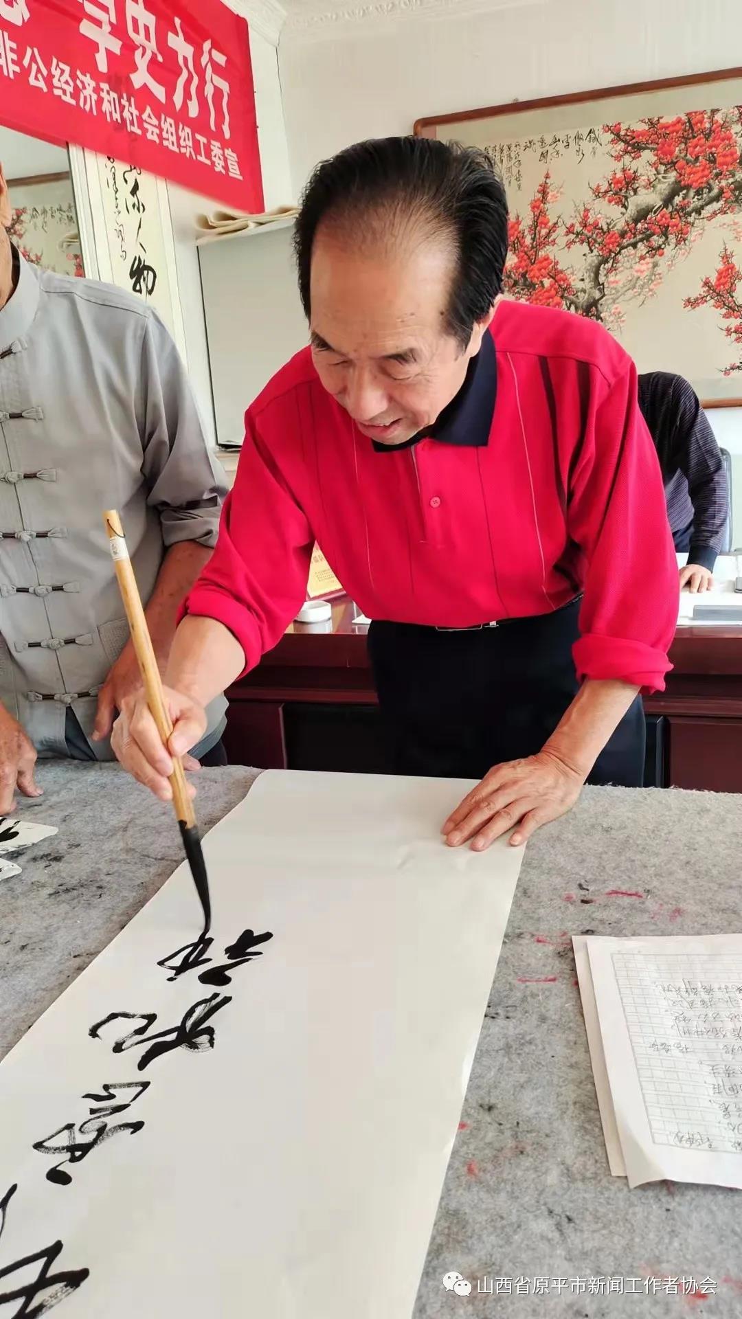 活動現(xiàn)場,大家暢所欲言,紛紛聯(lián)系思想實際,交流了學(xué)習(xí)黨史、明理知進的心得體會,圍繞學(xué)史長知、學(xué)史明理、學(xué)史增信、學(xué)史興業(yè)進行了熱烈討論。接著,書畫藝術(shù)組的書法家亢銀中、趙存仁、王玉伍、張正山、王福歲、王弘新,及學(xué)會顧問書畫名家溫樹森老師、以及特邀書畫名家李晉復(fù)先生,紛紛揮毫潑墨,書寫出學(xué)習(xí)黨史的感悟與名言。大筆揮灑中,一幅幅寫有“賡續(xù)精神血脈、傳承紅色基因”“明理增信.崇德力行”“不忘初心、牢記使命”和“江山就是人民、人民就是江山”等字樣的真、草、隸、篆、行書藝作品,從筆下飄然而出。墨香中呈現(xiàn)出各有千秋、韻味感人的風(fēng)格,博得觀賞者們的點贊稱道,并爭相拿到一幅贈品。書法家們顧不上喝水,整整忙了一個上午。特別是書畫藝術(shù)組組長李文光,由于平時在廣州忙于接送孩子上學(xué),放暑假回原平后特地趕來,高興地跟大家一起切磋書藝、展示才藝。書法家們還探討了書法藝術(shù)融入社會、融入黨性、服務(wù)大眾、服務(wù)中心的蹊徑、舉措與打算。(賈宣生 王福歲)