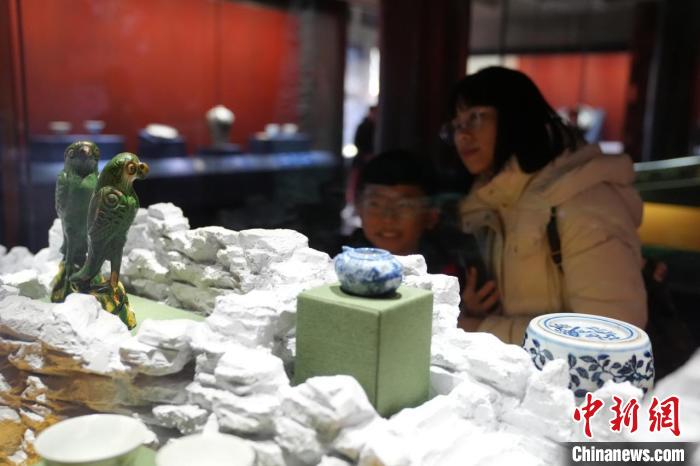 “御瓷凝瑞——景德鎮(zhèn)御窯遺址出土吉祥動(dòng)物紋瓷特展”現(xiàn)場,觀眾在觸摸距今約580年的景德鎮(zhèn)瓷器殘片。 史春陽 攝 恭王府在清代曾居住過多位皇室成員,當(dāng)時(shí)的陳設(shè)和日用瓷器也以景德鎮(zhèn)御窯出產(chǎn)為多。順應(yīng)明清時(shí)期盛行的祈福風(fēng)尚,恭王府的建筑在形制、裝飾等方面都體現(xiàn)著福瑞吉祥的寓意。尤其花園的設(shè)計(jì),以“?!睘橹行?,以詩為布局,直白處一目了然,含蓄處意境深遠(yuǎn),秀麗與凝重并存,反映著主人高雅的審美情趣,也傳達(dá)出祈福迎祥的強(qiáng)烈愿望。 明清景德鎮(zhèn)御窯出產(chǎn)的瓷器,亦多以吉祥紋樣為裝飾,或繁華或素樸,是當(dāng)時(shí)生活美學(xué)思想的重要體現(xiàn)。比如位于展廳中央的“宣德青花鸚鵡折枝花果紋盤”,直徑達(dá)72.3厘米,是不多見的御窯出品大器。盤心繪鸚鵡啄桃圖,畫意應(yīng)取自唐代詩人杜甫《山寺》詩中“麝香眠石竹,鸚鵡啄金桃”一句,象征著生機(jī)勃勃、自在安樂的生活狀態(tài)。鸚鵡音同“英武”,被古人視為瑞鳥,是廣受喜愛的寵禽。配合此件展品,還展出了恭王府博物館收藏的清道光年間綠釉鸚鵡一對(duì)。