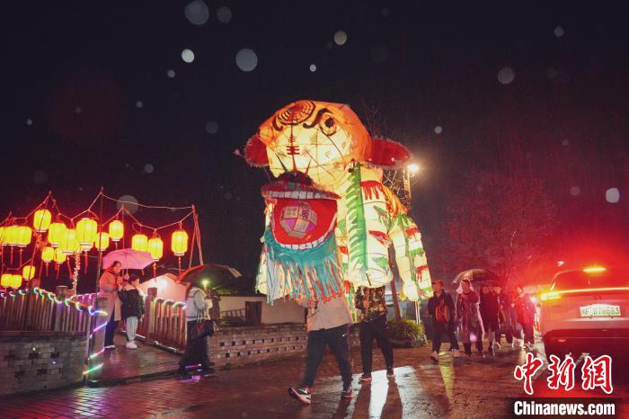 夜幕降臨,華燈初上,竹貫村的大街小巷都洋溢著濃郁的節(jié)日氛圍。雖然天空飄著小雨,但游客們熱情不減,只見五彩斑斕的花燈在夜幕下熠熠生輝,為新春佳節(jié)增添了更多的歡樂與奇幻。值得一提的是,部分花燈的內(nèi)部設(shè)計(jì)尤為復(fù)雜,游客輕輕一拉花燈下的繩子,上面的紙人就仿佛被賦予了生命,手舞足蹈,生動(dòng)形象。