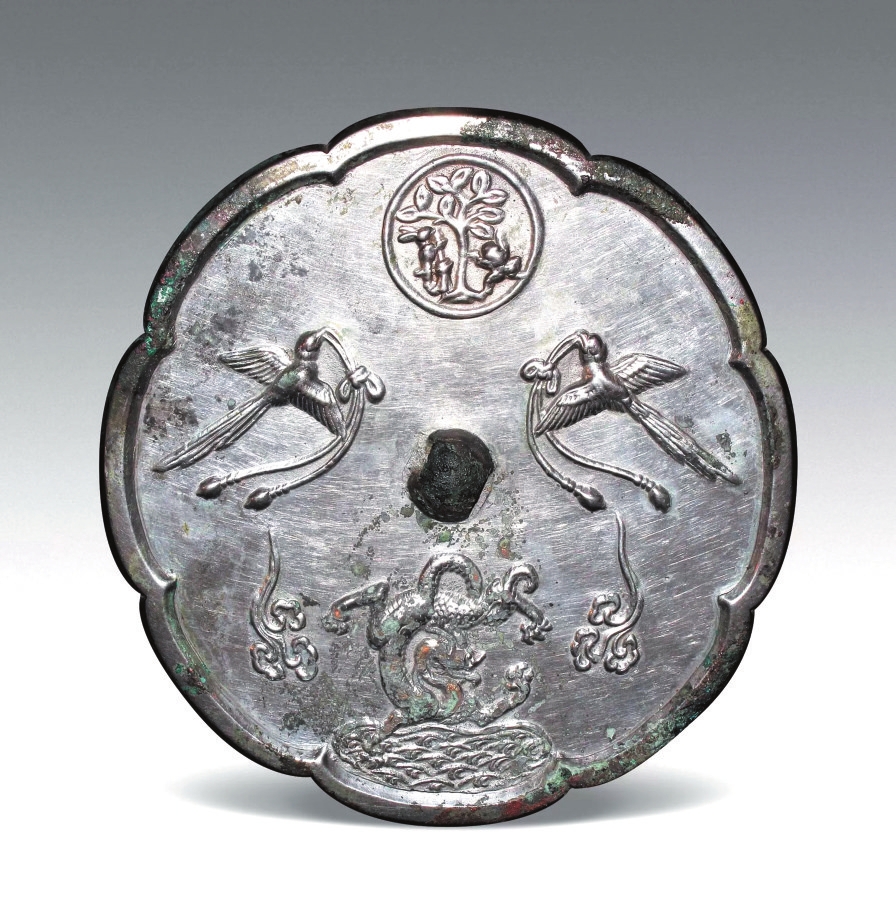 唐代張匯的《千秋鏡賦》云,千秋鏡背“或鑄或镕,是磨是削??桃詾辇?,鏤以成鵲”,《文苑英華》亦載“鵲飛如向月,龍盤以映池”,與盤龍雙鵲月宮鏡上的紋飾恰好相符。盤龍、雙鵲、祥云,月宮中的玉兔、蟾蜍、桂樹,成為此類銅鏡的畫面主體,引發(fā)人們對月宮的美好想象。
