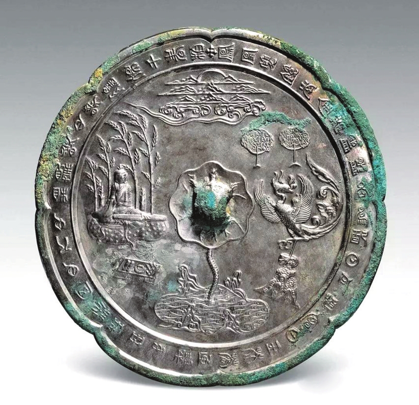 真子飛霜鏡一般都是圓形、葵花形,而西安出土的一面鏡形十分罕見,為亞字形。鏡背上方云海托月,半個(gè)月亮浮上來。真子飛霜鏡的形制,多在細(xì)節(jié)上略有差異。除了鏡鈕上方有“真子飛霜”四字,或者有一只飛翔的仙鶴之外,還有一種在鏡緣飾篆書體銘文,鏡銘為:“鳳凰雙鏡南金裝。陰陽各為配,日月恒相會。白玉芙蓉匣,翠羽瓊瑤帶。同心人,心相親,照心照膽保千春?!?/p>