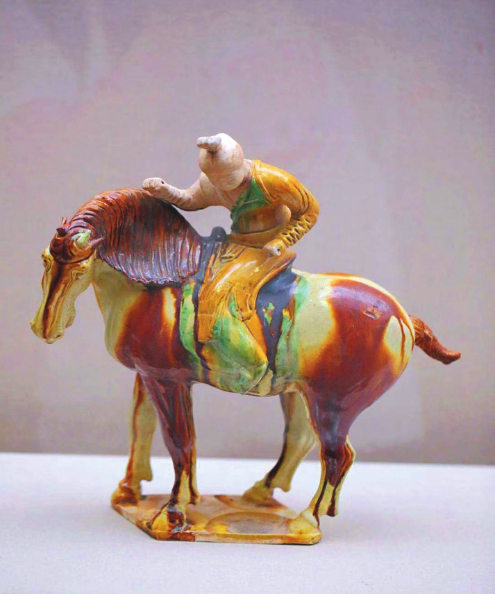 唐代女子也熱愛打馬球,《明皇擊球圖》展現(xiàn)了唐玄宗與后宮妃嬪打馬球的場景,河南洛陽唐代王雄誕夫人魏氏墓曾出土四件三彩打馬球女俑。唐代詩文中也有女子打球的記載,王建《送裴相公上太原》中寫“千群白刃兵迎節(jié),十對紅妝妓打球”,張籍的《寒食內(nèi)宴二首》亦云“廊下御廚分冷食,殿前香騎逐飛球”的詩句。由于馬球運(yùn)動的流行,唐代有很多與馬球相關(guān)的文物,流傳至今的馬球、球桿、球場碑石、繪畫、泥塑等數(shù)不勝數(shù)。