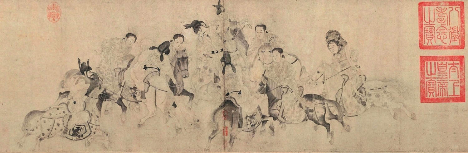 馬球的流行,也曾起到交流媒介的作用。遼代陳及之所繪《便橋會盟圖》,記錄了唐太宗和東突厥頡利可汗在渭水便橋會盟時,大唐和突厥進(jìn)行馬球比賽的場景。唐中宗時,吐蕃派使者迎接金城公主入藏,使團(tuán)中有馬球高手。彼時吐蕃請求與大唐比賽馬球,唐中宗派出的選手被吐蕃打敗,接著又派出當(dāng)時還是臨淄王的唐玄宗李隆基和嗣虢王李邕、駙馬楊慎交、駙馬武延秀等人再與吐蕃比賽,獲得勝利。據(jù)《封氏聞見記》載:“玄宗東西驅(qū)突,風(fēng)回電激,所向無前,吐蕃功不獲施?!?/p>