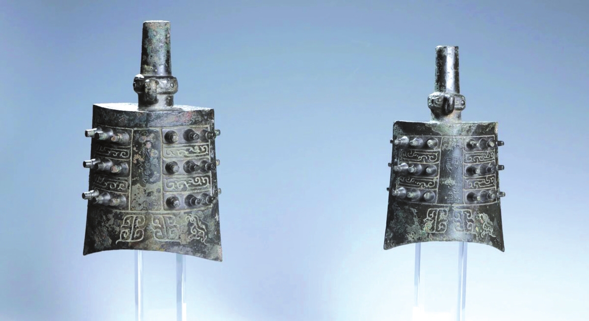 在形制上,編鐘有兩種——甬鐘和鈕鐘,最上面的平面立有“甬柱”的為甬鐘,立有“懸鈕”的則是鈕鐘。在我國已發(fā)現(xiàn)的甬鐘中,具有代表性的是晉侯蘇鐘,鑄造于西周,形制精確,音律精準。鈕鐘西周晚期較多,三門峽出土的虢仲鈕鐘是目前已知最早的鈕鐘。《孟子》中記載了一個關(guān)于鈕鐘的故事,孟子和學(xué)生高子親眼看到過一個夏禹時的鈕鐘,高子看到懸鈕像蟲蛀過一樣快斷了,猜測這是因為此鐘聲音好、用得多。