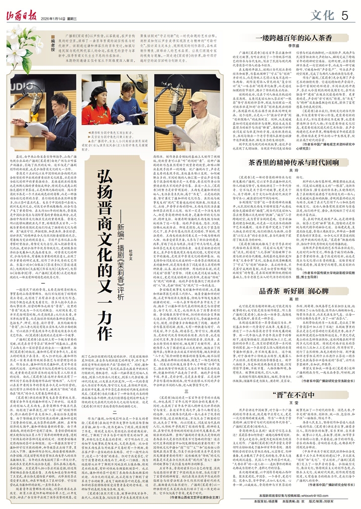 《山西日?qǐng)?bào)》(2026年01月14日 第05版) ■編者按 廣播劇《茉莉香》以聲傳情,以茶載道,在聲音構(gòu)筑的時(shí)空里,演繹了一曲百年晉商的誠(chéng)信傳承與時(shí)代新聲。該劇通過(guò)謙和祥茶莊的百年變遷,細(xì)膩勾連民國(guó)與現(xiàn)代兩代茶人的命運(yùn),在技藝的堅(jiān)守與革新中,探尋晉商文化生生不息的內(nèi)在脈動(dòng)。 本期特別邀請(qǐng)五位專家從不同維度深入解讀,聚焦該劇對(duì)“守正創(chuàng)新”這一時(shí)代命題的藝術(shù)詮釋,剖析其如何以聲音美學(xué)實(shí)現(xiàn)歷史與精神的“可聆聽(tīng)化”,探討其立足本土、觀照現(xiàn)實(shí)的創(chuàng)作路徑,品味其制作精良、演繹動(dòng)人的藝術(shù)品質(zhì)。讓我們跟隨專家的視角與筆觸,一同走進(jìn)《茉莉香》的世界,聆聽(tīng)那穿越時(shí)空的誠(chéng)信回響與創(chuàng)新足音。