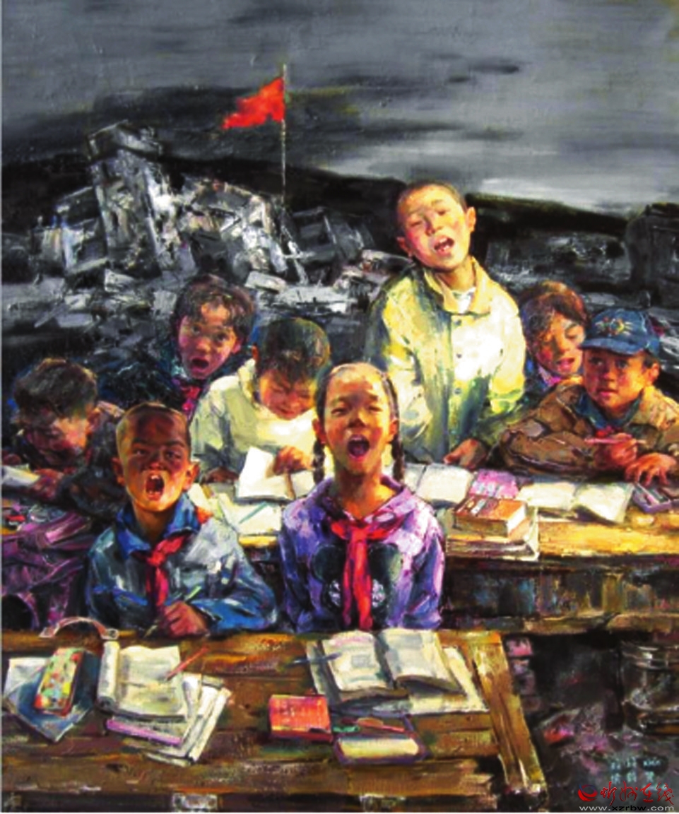 同樣表現(xiàn)地震題材的另一幅作品《震后復(fù)課》則展示出另外一種浪漫情懷,發(fā)人深省,令人感慨萬千。在尚未處理完畢的地震廢墟上,孩子們真誠地開始了希望的追求,展示著大震壓不垮的人性力量和災(zāi)后最具震撼力的希望。是的,紅旗在哪里,精神支撐就在哪里。孩子是希望,是未來。在孩子們的臉上,沒有恐懼和悲哀,沒有茫然與無助,有的只是對(duì)知識(shí)的渴望,對(duì)未來的憧憬。一個(gè)角落的復(fù)課場景,映射著中華民族偉大復(fù)興的精神力量。 邢晨聲 文