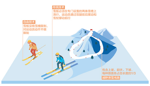 越野滑雪是借助滑雪器材,運用登山、轉彎、滑行等技術,滑行于山丘雪原的運動項目,賽道線路長、比賽時間長,被稱為“雪上馬拉松”。1924年,在第一屆冬奧會上,越野滑雪便被列為比賽項目。越野滑雪線路包含上坡、起伏、下坡3種路面,每種路面各占總長度的1/3。根據到達終點的用時多少排列名次。