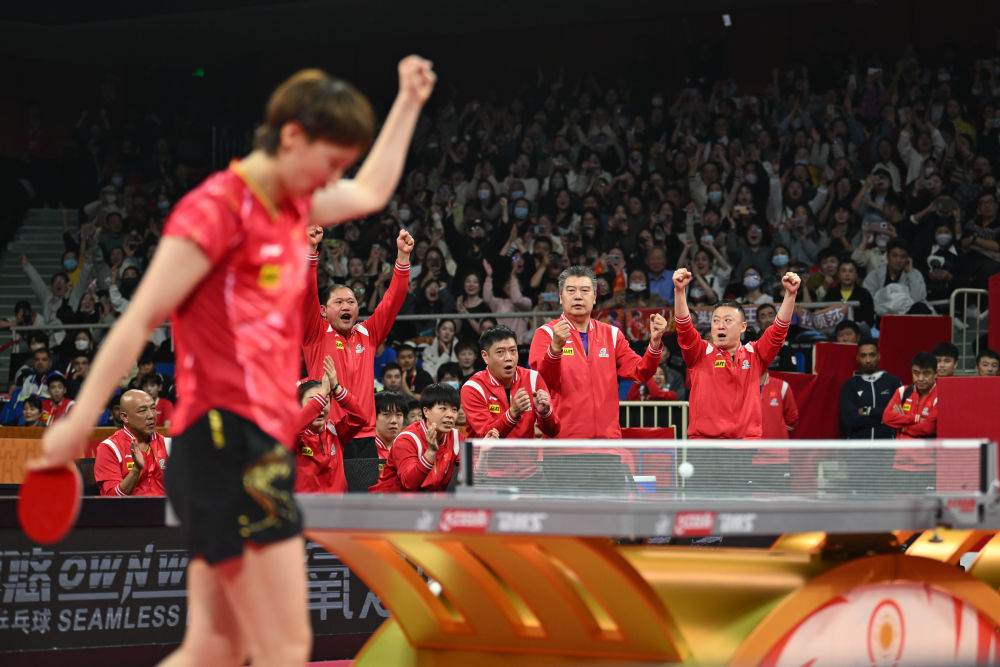 12月7日,中國隊選手王曼昱與教練員在得分后慶祝。新華社記者 胥冰潔 攝