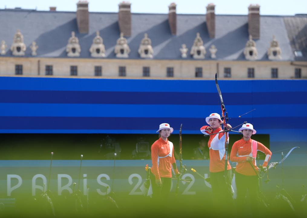 巴黎奧運(yùn)會射箭女子團(tuán)體比賽28日在榮軍院進(jìn)行。中國隊(duì)在四分之一決賽、半決賽中分別戰(zhàn)勝印度尼西亞隊(duì)和墨西哥隊(duì),與先后戰(zhàn)勝中國臺北、荷蘭隊(duì)的韓國隊(duì)會師決賽。