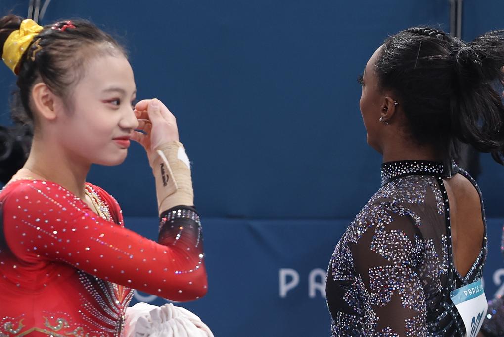 7月28日,美國(guó)選手拜爾斯(右)與中國(guó)選手邱祺緣在轉(zhuǎn)換項(xiàng)目。當(dāng)日,巴黎奧運(yùn)會(huì)體操女子資格賽在貝爾西體育館舉行。 新華社記者 曹燦 攝