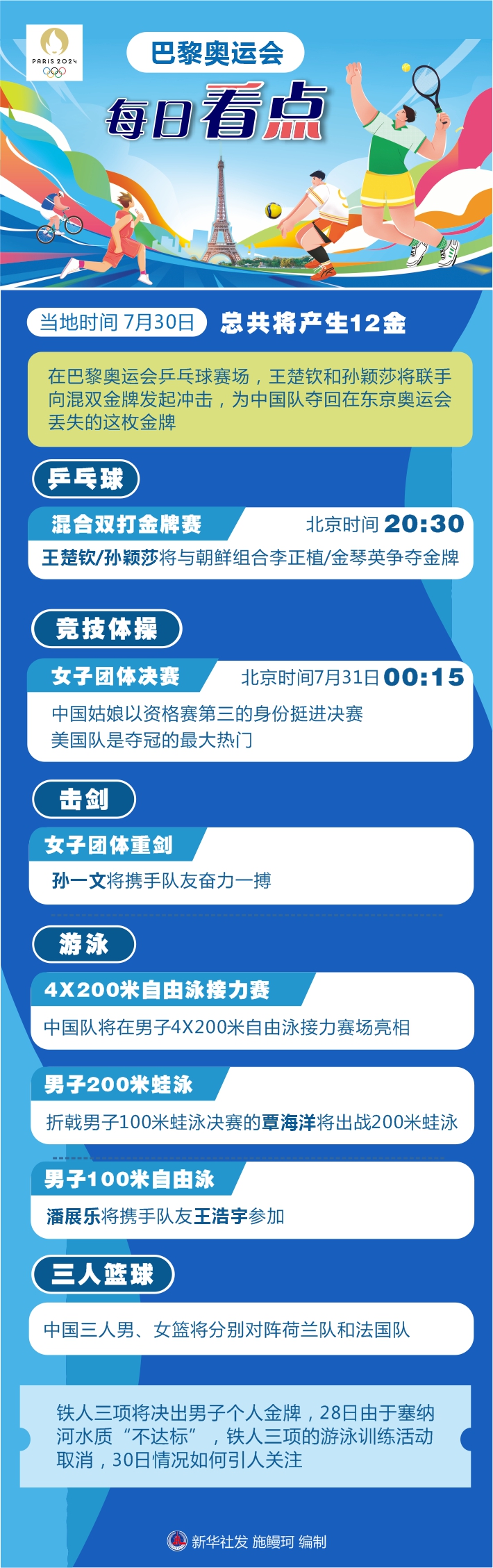 還有一些項(xiàng)目將拉開(kāi)戰(zhàn)幕。中國(guó)三人男、女籃將分別對(duì)陣荷蘭隊(duì)和法國(guó)隊(duì)。鐵人三項(xiàng)將決出男子個(gè)人金牌,28日由于塞納河水質(zhì)“不達(dá)標(biāo)”,鐵人三項(xiàng)的游泳訓(xùn)練活動(dòng)取消,30日情況如何引人關(guān)注。