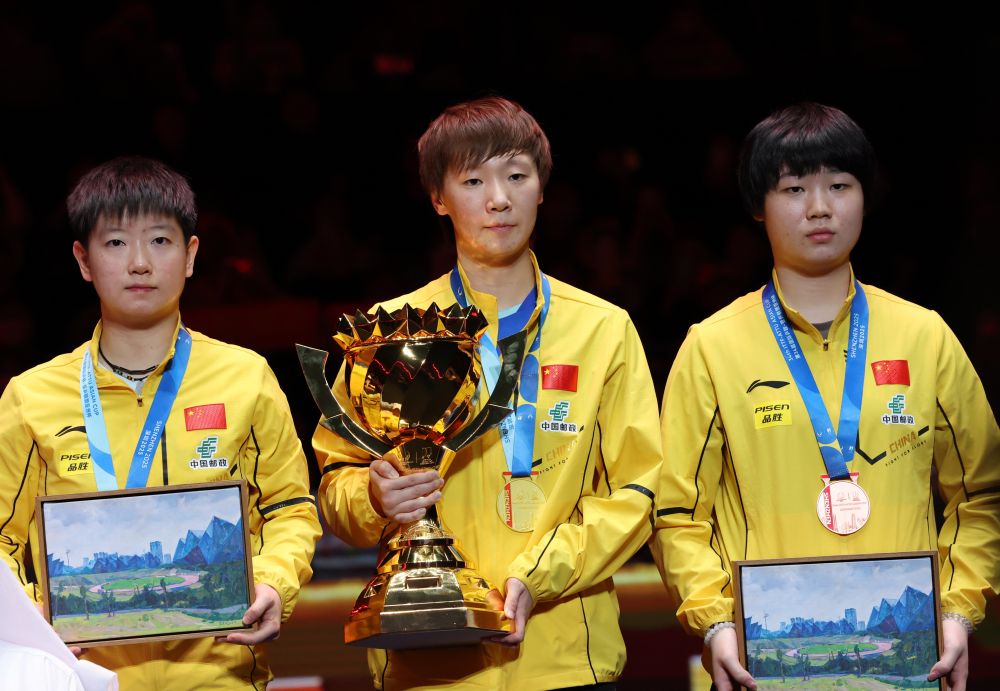 2月23日,冠軍王曼昱(中)、亞軍孫穎莎(左)和季軍蒯曼在頒獎(jiǎng)儀式上合影。當(dāng)日,在廣東深圳舉行的第34屆國際乒聯(lián)-亞乒聯(lián)盟亞洲杯女子單打決賽中,中國選手王曼昱4比0戰(zhàn)勝隊(duì)友孫穎莎,奪得冠軍。新華社記者 盧漢欣 攝