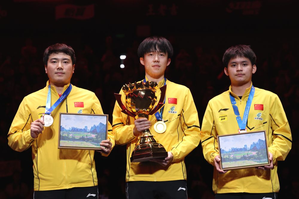 2月23日,冠軍王楚欽(中)、亞軍梁靖崑(左)和季軍林詩棟在頒獎(jiǎng)儀式上合影。當(dāng)日,在廣東深圳舉行的第34屆國際乒聯(lián)-亞乒聯(lián)盟亞洲杯男子單打決賽中,中國選手王楚欽4比0戰(zhàn)勝隊(duì)友梁靖崑,奪得冠軍。新華社記者 梁旭 攝