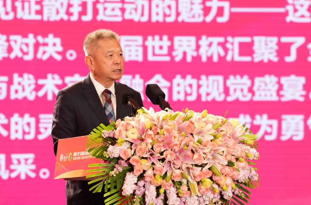 吳廷貴在開幕式上致辭。 繼去年舉辦2024國(guó)際武術(shù)邀請(qǐng)賽后,江陰再次迎來(lái)一場(chǎng)大型國(guó)際武術(shù)賽事。在三天時(shí)間里,共有來(lái)自26個(gè)國(guó)家和地區(qū)的近200名運(yùn)動(dòng)員、教練員、隨隊(duì)官員以及技術(shù)官員參賽。 國(guó)際武聯(lián)副主席吳廷貴表示,本屆賽事匯聚全球頂尖散打精英,是一場(chǎng)集精湛技藝、力量之美與拼搏精神于一體的巔峰對(duì)決,更是武術(shù)文化傳承與競(jìng)技體育精神的完美融合,希望運(yùn)動(dòng)員們可以在此締結(jié)友誼。