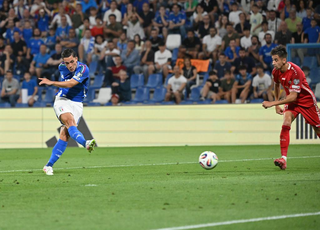 6月9日,意大利隊(duì)球員拉斯帕多里(左)在比賽中射門(mén)得分。新華社發(fā)(阿爾貝托·林格利亞攝)