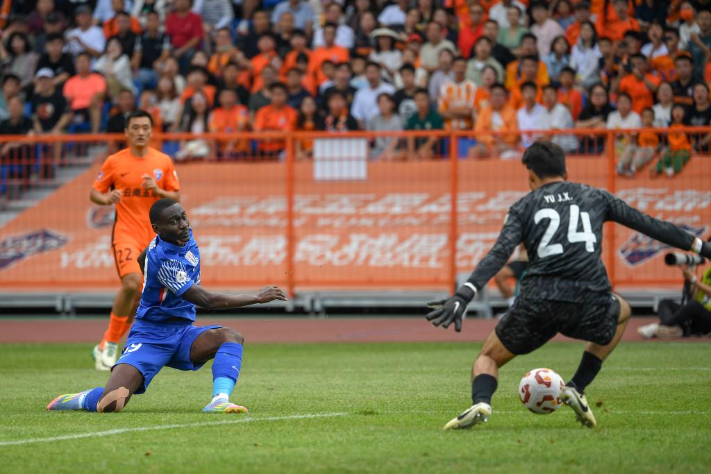 8月2日,成都蓉城隊(duì)球員韋世豪(左)在比賽中射門(mén)。新華社發(fā)(尹鋼攝)