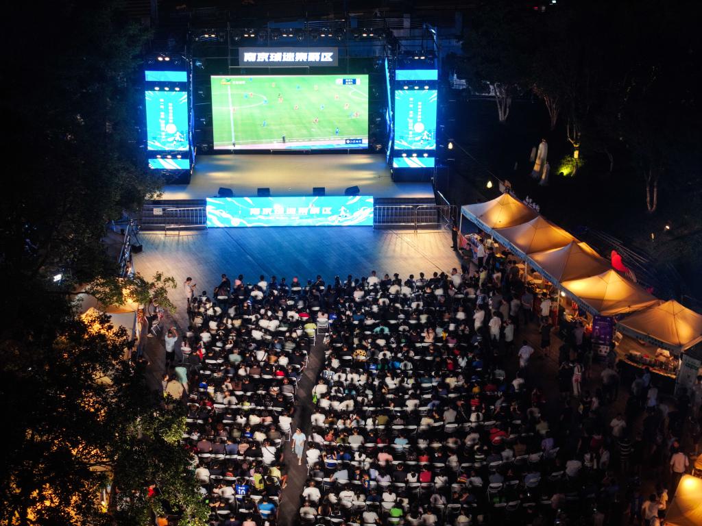 8月17日,球迷在南京一個露天屏幕前觀看2025江蘇省城市足球聯(lián)賽(“蘇超”)第九輪比賽。新華社記者 季春鵬 攝
