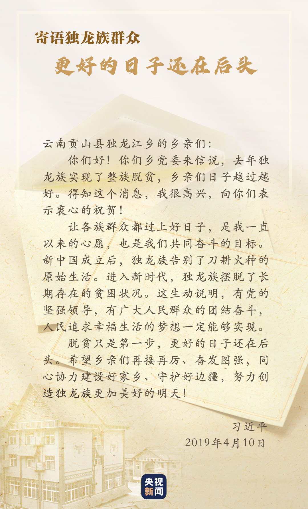 2018年,獨龍江鄉(xiāng)6個行政村整體脫貧,獨龍族實現(xiàn)整族脫貧,基礎(chǔ)設(shè)施、特色產(chǎn)業(yè)、社會事業(yè)等都發(fā)生了巨大變化。貢山縣干部群眾再次給習近平寫信匯報脫貧成績,習近平得知后非常高興,向他們表示“衷心的祝賀”,并勉勵鄉(xiāng)親們?yōu)檫^上更加幸福美好的生活繼續(xù)團結(jié)奮斗。