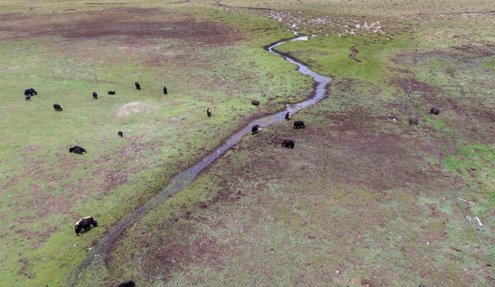 2023年6月8日,青海省玉樹藏族自治州稱多縣珍秦鎮(zhèn)十一村的牦牛在吃草(無人機(jī)照片)。新華社記者陳杰 攝 夏日高原,碧空如洗,長江源區(qū)牦牛轉(zhuǎn)入水草豐美的夏季草場。青海省玉樹藏族自治州稱多縣珍秦鎮(zhèn)十一村黨支部書記久美旦周正盤算合作社牦牛的出欄安排:“前面剛賣了200頭,還有900多頭存欄,今年村民分紅又能上臺階?!?/p> 珍秦鎮(zhèn)十一村位于嘉塘草原腹地,距長江上游通天河約50公里。50歲的久美旦周見證了村里草原從退化到復(fù)綠。他回憶說,過去分草到戶,各家用鐵絲網(wǎng)圈起草場,“牛羊越來越多,圍欄里的草都‘啃禿’了”。 在平均海拔超4500米的長江源區(qū),牦牛、藏羊是當(dāng)?shù)啬撩袷来蕾嚨纳媮碓?。一些區(qū)域過去牛羊超載,生態(tài)惡化。