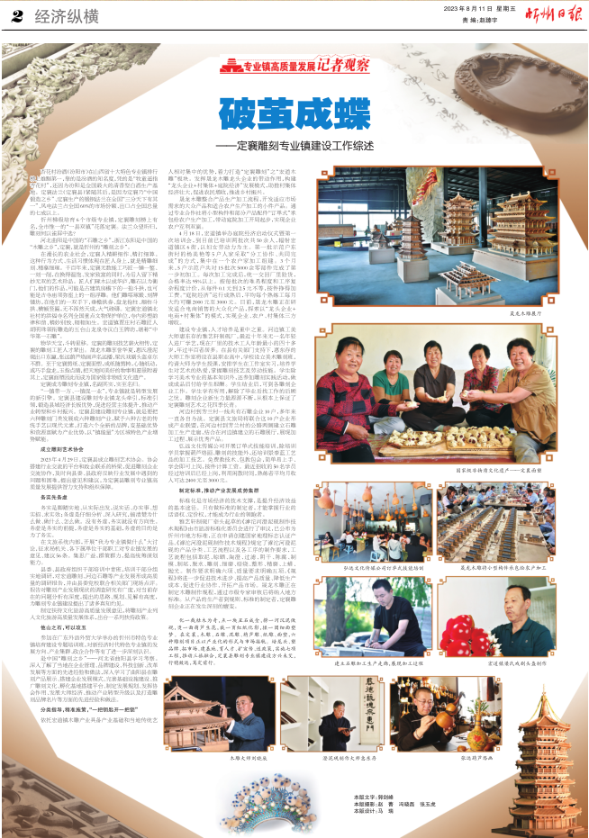化一截枯木為奇,點一塊丑石成金,撈一河沉泥做硯,燙一面葫蘆生花,裁一頁紅紙化影,揉一團細面塑夢。在定襄,木雕、石雕、泥雕、葫蘆雕、紙雕、面塑,六種雕刻項目正以產(chǎn)業(yè)化的形式與市場接軌。培龍頭、塑品牌、拓市場、建基地、育人才、擴宣傳、送政策,實施七項工程,推動三旅融合,定襄縣雕刻專業(yè)鎮(zhèn)建設(shè)方興未艾,行穩(wěn)致遠,篤定前行。