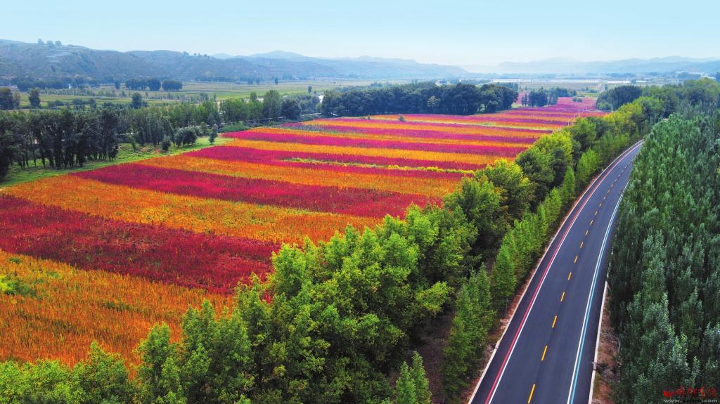 金秋時節(jié),靜樂藜麥陸續(xù)進入成熟期。不同品種的藜麥成熟后,麥穗呈現(xiàn)出火紅、金黃、紫紅等多種色彩,藜麥田宛如一幅色彩斑斕的油畫。在陽光的照射下,隨風搖擺的藜麥穗和村民們忙碌的身影組成了秋日的豐收美景圖。