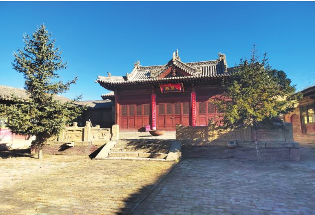 一進(jìn)院布局,中軸線(xiàn)現(xiàn)存有正殿1棟,兩側(cè)建有配殿,西北角建有偏殿。正殿磚砌臺(tái)基,面寬五間,進(jìn)深六椽,七檁前后廊式構(gòu)架,前檐斗拱為五踩,后檐為三踩斗拱,單檐懸山頂。前設(shè)月臺(tái),建有抱廈三間,單檐歇山頂。現(xiàn)新塑像3尊,正殿梁架有彩繪。