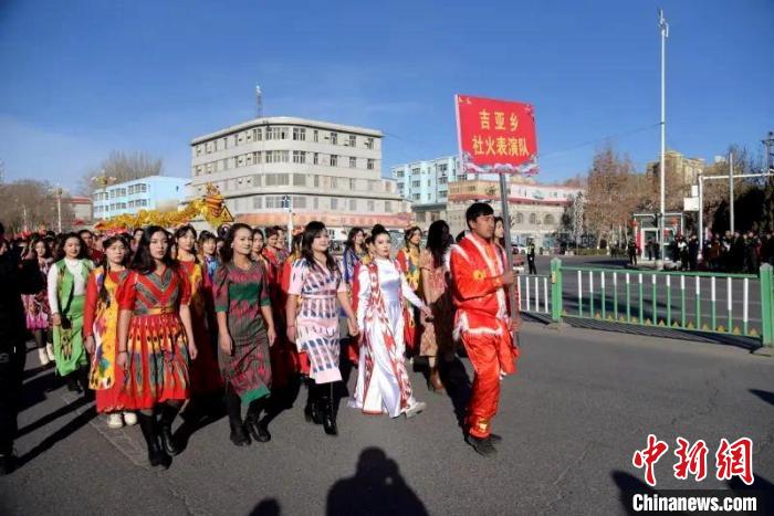 2月12日,農(nóng)歷正月初三,和田市舉行2024年“龍騰盛世·春滿萬(wàn)家”社火活動(dòng),和田市伊里其鄉(xiāng)社火表演隊(duì)巡街。 張亞輝 攝
