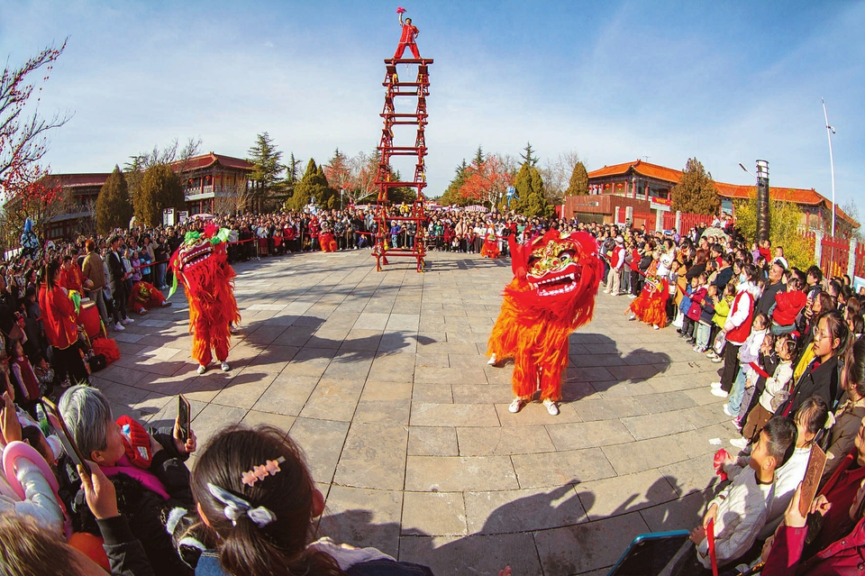 運城市鹽湖區(qū)舜帝陵景區(qū)內舞獅隊正在進行舞獅表演。姜樺攝
