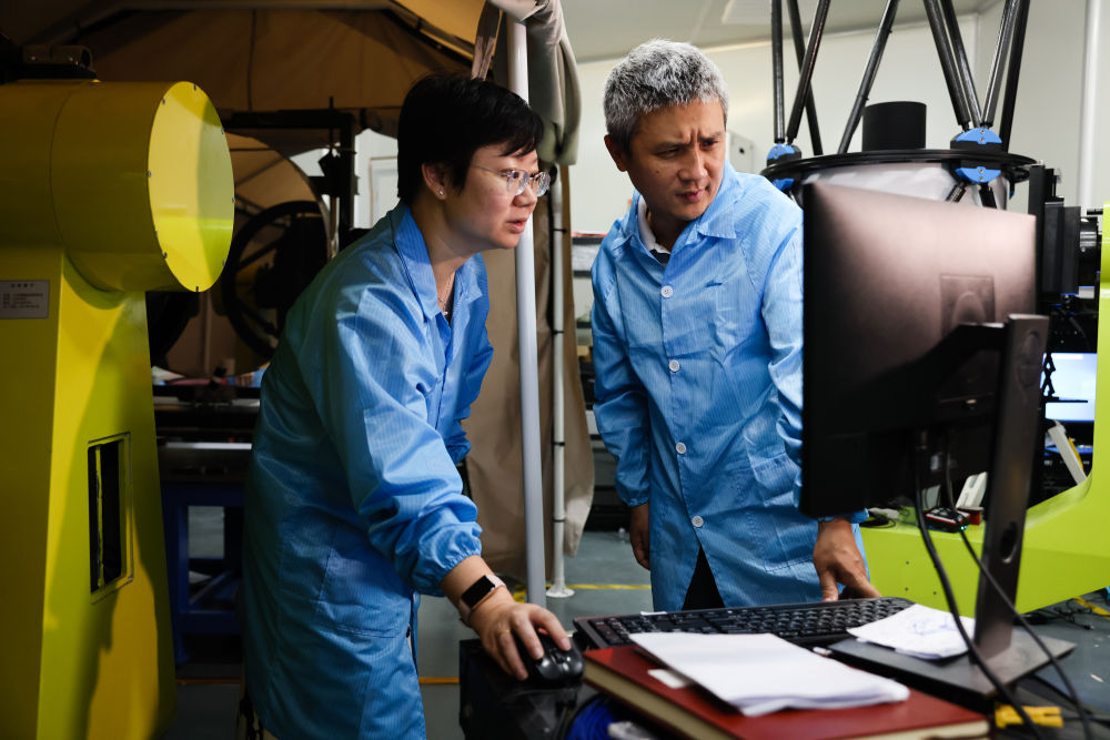 在中國科學(xué)技術(shù)大學(xué)上海研究院實(shí)驗(yàn)室,印娟(左)和同事在查看實(shí)驗(yàn)數(shù)據(jù)(2023年7月22日攝)。新華社記者 金立旺 攝