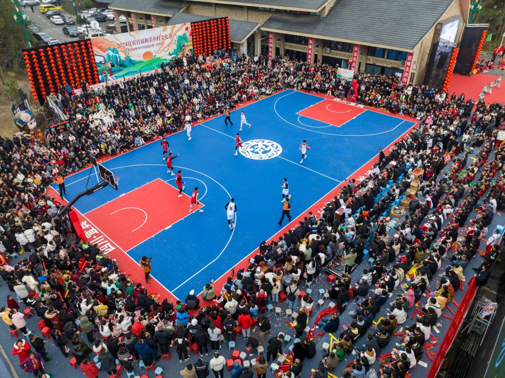2024年1月29日,村民、游客在現(xiàn)場觀賽(無人機(jī)照片)。當(dāng)日,在四川省宜賓市珙縣巡場鎮(zhèn)三合村,2024宜賓首屆和美鄉(xiāng)村文化節(jié)暨首屆和美鄉(xiāng)村籃球決賽(村BA)舉行,同時(shí),現(xiàn)場還舉行了非遺年貨購物節(jié)、消費(fèi)券發(fā)放等活動(dòng),以賽事經(jīng)濟(jì)激發(fā)鄉(xiāng)村活力。新華社發(fā)(莊歌爾攝)