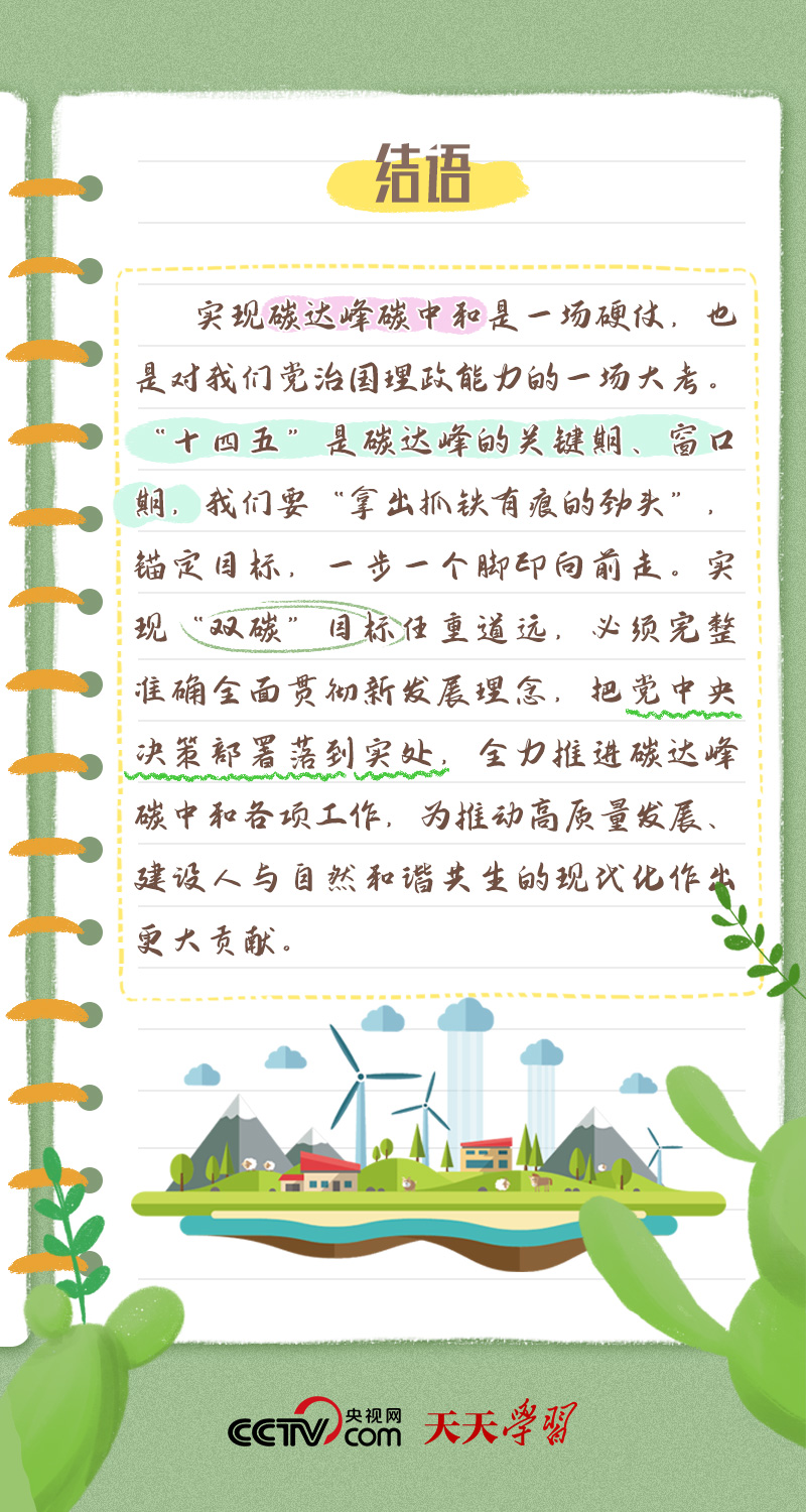 天天學(xué)習(xí)今年全國兩會,習(xí)近平總書記在政協(xié)聯(lián)組會上,對“雙碳”工作作出最新部署??倳洀?qiáng)調(diào):“全面準(zhǔn)確落實精準(zhǔn)治污、科學(xué)治污、依法治污方針,推動經(jīng)濟(jì)社會發(fā)展綠色化、低碳化,加強(qiáng)資源節(jié)約集約循環(huán)利用,拓展生態(tài)產(chǎn)品價值實現(xiàn)路徑,積極穩(wěn)妥推進(jìn)碳達(dá)峰碳中和,為高質(zhì)量發(fā)展注入新動能、塑造新優(yōu)勢。” 實現(xiàn)碳達(dá)峰碳中和,是以習(xí)近平同志為核心的黨中央統(tǒng)籌國內(nèi)國際兩個大局作出的重大戰(zhàn)略決策,是著力解決資源環(huán)境約束突出問題、實現(xiàn)中華民族永續(xù)發(fā)展的必然選擇,是對推動構(gòu)建人類命運共同體的莊嚴(yán)承諾。