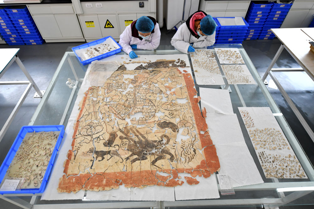 在云岡研究院壁畫文物修復(fù)室,工作人員張曉娟(左)、吳朝霞在進(jìn)行壁畫修復(fù)(2021年5月9日攝)。