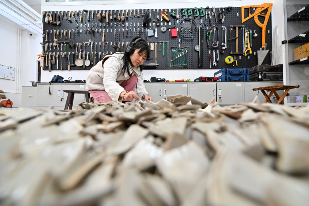 在云岡研究院可移動(dòng)文物修復(fù)室,工作人員高嘉珩在進(jìn)行瓷器修復(fù)(2024年2月26日攝)。