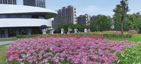 百合花種類繁多,形態(tài)各異。純凈高雅的白色、熱情嫵媚的紅色、明麗澄澈的橙黃、浪漫俏皮的粉紅、雍容華貴的紫色,形似漏斗,又如喇叭,或向上開花,張揚(yáng)外翻、極端華麗,或含露低垂,矜持含蓄、超凡脫俗?;ㄩg蜂蝶飛舞,暗香浮動(dòng),游人三五成群,在花叢合影拍照,游玩嬉戲,好不愜意。市民王女士對(duì)這里贊賞有加:“看到這五顏六色的百合花,我的心情像盛開的花一樣,特別美!這里每季有每季的花開,每次來都有不一樣的驚喜和精彩?!?/p>