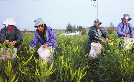 夜色如墨,黃花地里逐漸閃爍起點(diǎn)點(diǎn)星光,那是采摘工頭上佩戴的射燈亮了起來(lái),他們?nèi)蔽溲b,長(zhǎng)袖長(zhǎng)褲、雨靴、雨衣、防蟲(chóng)帽、頭燈一應(yīng)俱全。