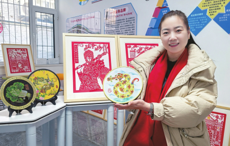 當(dāng)日,下站街道文化活動(dòng)室五顏六色、惟妙惟肖的彩色剪紙作品,也讓之前只見過紅色剪紙作品的記者眼前一亮?!斑@是染色剪紙。制作之前,需要先在白紙上起稿。剪出來后,會(huì)根據(jù)不同部位的特點(diǎn)進(jìn)行上色,讓作品更加生動(dòng)、更加活靈活現(xiàn)?!倍绶冀榻B,這次剪紙活動(dòng)也是街道“非遺賀新春”主題活動(dòng)的一部分,圍繞蛇年主題系列進(jìn)行創(chuàng)作。