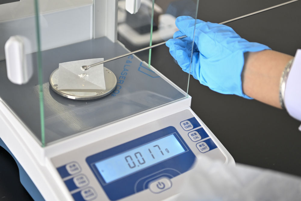 4月16日,在云岡研究院石質(zhì)文物保護(hù)研究室,工作人員張帆為石窟壁面樣本稱重。云岡石窟現(xiàn)存主要洞窟45個(gè)