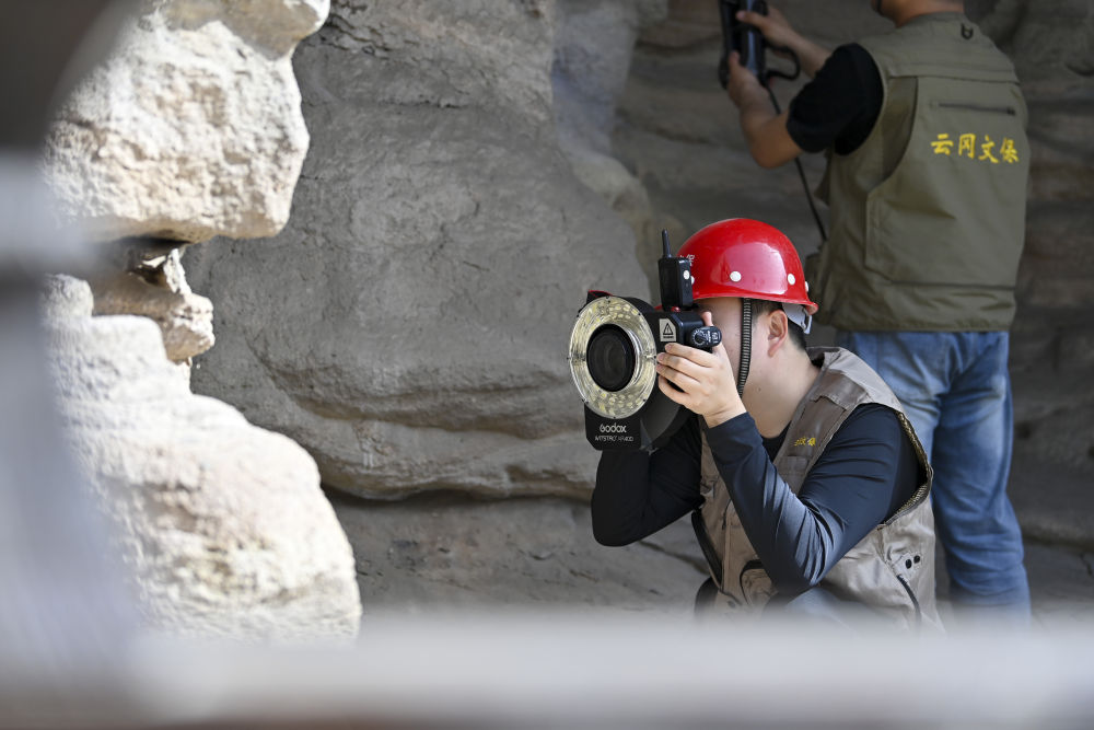 4月16日,云岡研究院數(shù)字化保護(hù)中心工作人員黃繹帆(左)在云岡石窟進(jìn)行數(shù)字化信息采集。