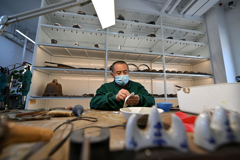 4月15日,在云岡研究院可移動(dòng)文物修復(fù)室,工作人員劉銓義在進(jìn)行瓷器修復(fù)。
