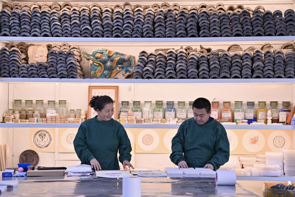 4月15日,在云岡研究院可移動(dòng)文物修復(fù)室,工作人員安永芳(左)和魏松林為接下來(lái)的研學(xué)活動(dòng)準(zhǔn)備相關(guān)用品。