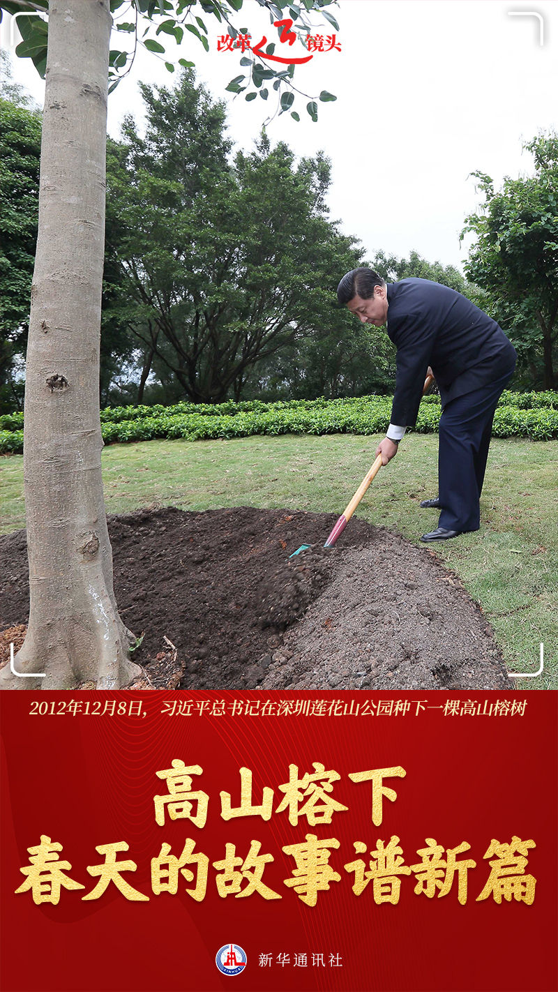 深圳蓮花山,一棵迎風(fēng)而立的高山榕,挺拔茂盛。樹前一方花崗石碑上,鐫刻著“習(xí)近平手植樹”。