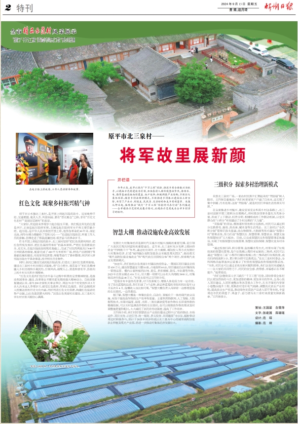 今年以來,我市以踐行“千萬工程”經(jīng)驗、推進鄉(xiāng)村全面振興為抓手,以精品示范村建設(shè)為引領(lǐng),加快農(nóng)村人居環(huán)境整治步伐,推動水、電、路等基礎(chǔ)設(shè)施向村覆蓋、向戶延伸;積極調(diào)整產(chǎn)業(yè)結(jié)構(gòu),不斷壯大集體經(jīng)濟;探索鄉(xiāng)村治理新模式,不斷推進鄉(xiāng)村振興建設(shè)邁上新臺階,書寫了產(chǎn)業(yè)興、環(huán)境美、民風(fēng)淳、生活好的和美鄉(xiāng)村新篇章。本報從即日起,陸續(xù)推出“踐行‘千萬工程’經(jīng)驗忻州在行動”系列報道——全市精品示范村風(fēng)采展示特刊,讓精品示范村成為全市鄉(xiāng)村學(xué)習(xí)的標桿。