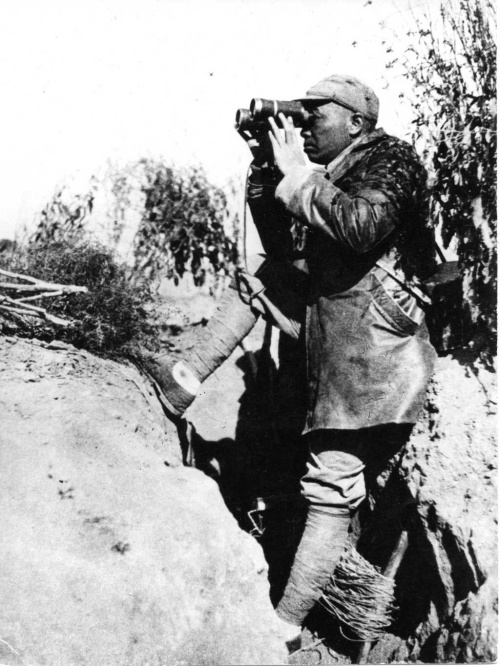 “誰(shuí)敢橫刀立馬,唯我彭大將軍?!闭掌?,彭德懷大半個(gè)身體露在戰(zhàn)壕外,左腳踏在戰(zhàn)壕底,右腳蹬著戰(zhàn)壕前沿,坐靠在戰(zhàn)壕后沿上,手持望遠(yuǎn)鏡,神情專注地觀察戰(zhàn)況。