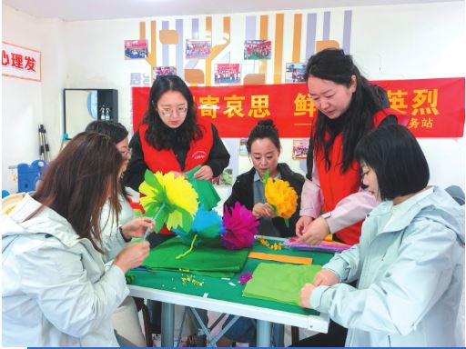 清明寄哀思,文明樹新風(fēng)。定襄縣南城社區(qū)組織工作人員與社區(qū)居民手工制作祭祀花,并免費(fèi)向社區(qū)居民發(fā)放,引導(dǎo)大家摒棄燒紙陋習(xí),以環(huán)保、溫情的方式追思先人。圖為社區(qū)工作人員與居民一同制作手工祭祀花。 郭婧蕾攝 (責(zé)任編輯:梁艷) |